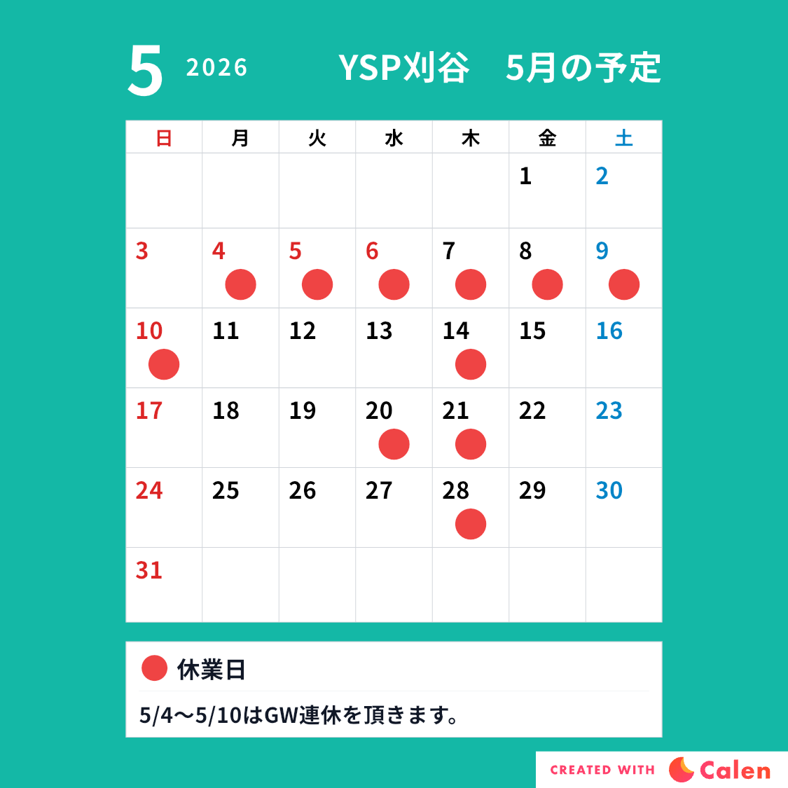 ★ 5月の営業&GW連休のお知らせ ★